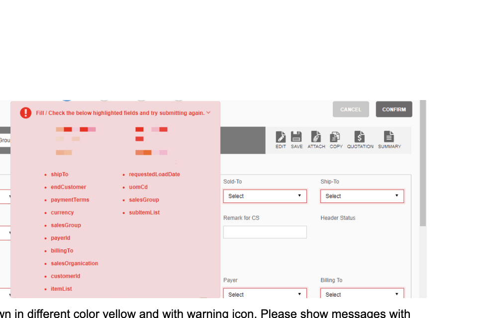 On clicking Save send a request (POST Method): http://13.67.38.104:8080/inquiry/api/bid & based on the response show the success or error message. On Clicking Save button, the modifed data will get updated in the JSON which is stored at client side. (The requirement is to save the user modified data in the JSON which is stored a at client side. When user go back to master screen and click Save in Master screen , Backend Save API is called and this will save the entire changes (Master and itemdetail apge) in db. This part is already implemented in Master Screen. We need to ensure the JSON stored at client side and both Master and ItemDetails page should share the same JSON which is retrieved from backend at the time of master screen page load. There should not be any backend API call from item details except Search&dropdown. )- On clicking Confirm, validate all the editable fields. If error show the error message.