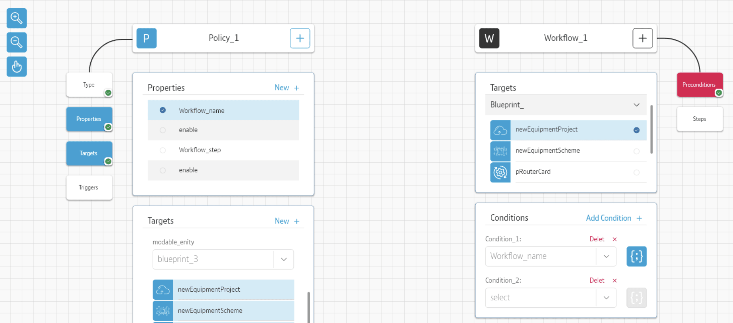 - For any selected "Step" the Target widget shows two option to select Modable_Entity & Target: